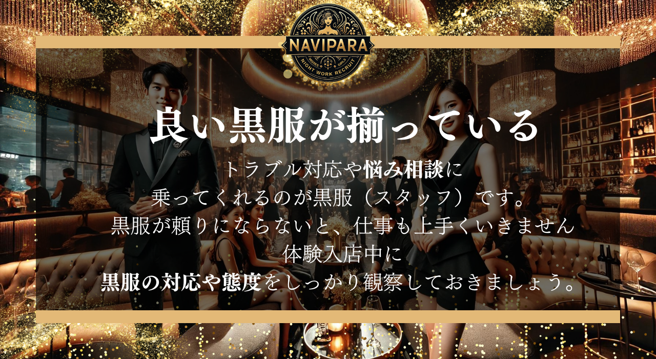 トラブル対応や悩み相談に乗ってくれるのが黒服(スタッフ)です。黒服が頼りにならないと、仕事も上手くいきません。体験入店中に、黒服の対応や態度をしっかり観察しておきましょう。
