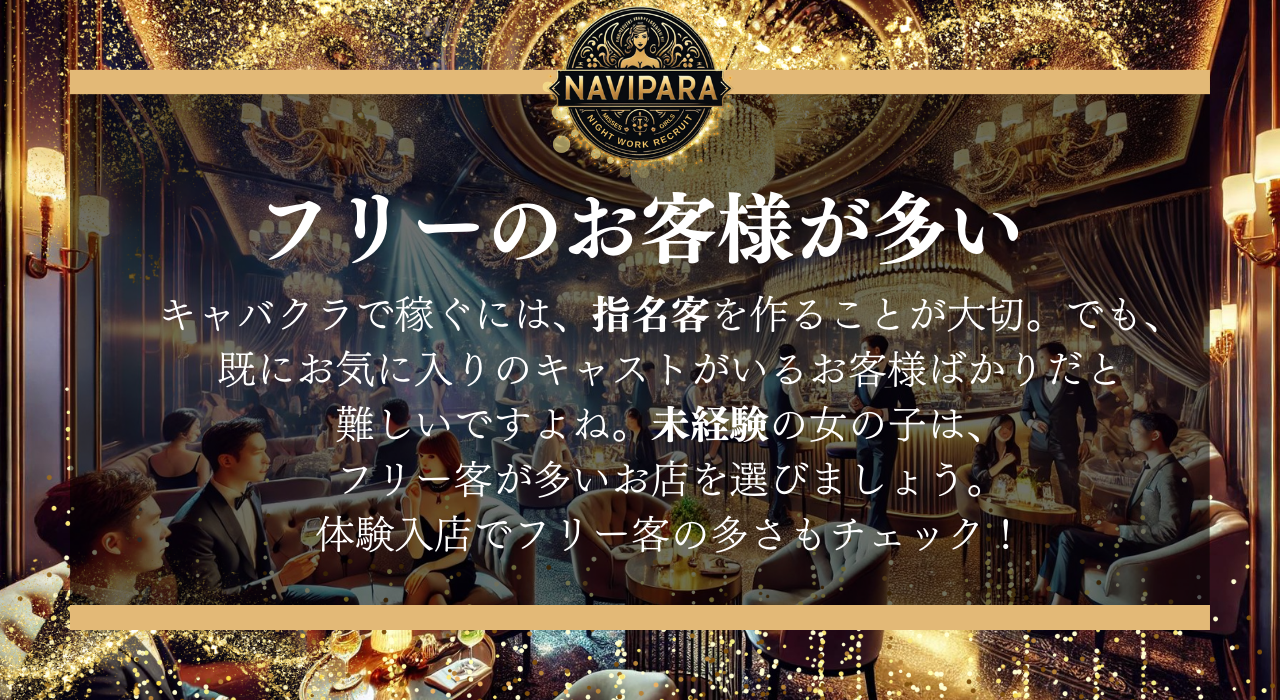 キャバクラで稼ぐには、指名客を作ることが大切。でも、既にお気に入りのキャストがいるお客様ばかりだと難しいですよね。未経験の女の子は、フリー客が多いお店を選びましょう。体験入店でフリー客の多さもチェック!