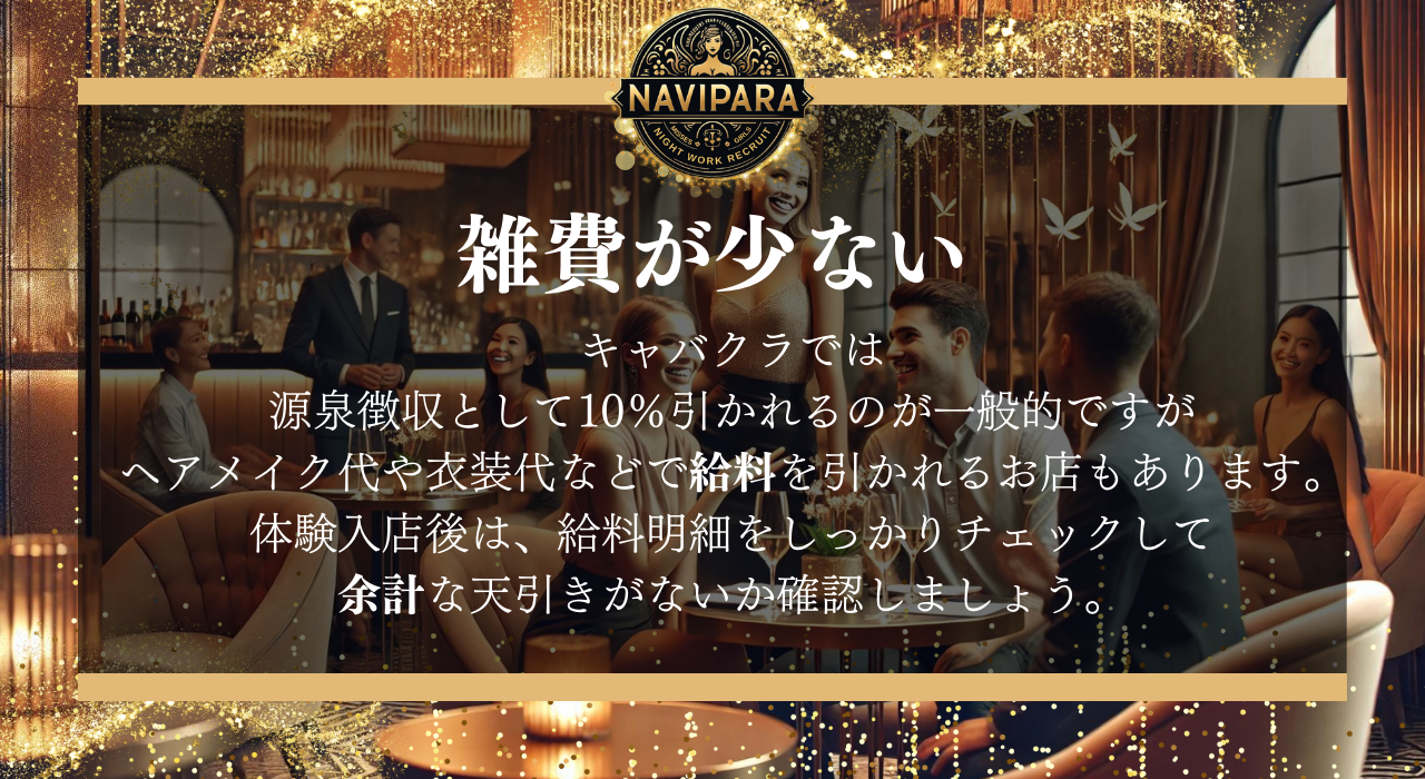 キャバクラでは、源泉徴収として10%引かれるのが一般的ですが、ヘアメイク代や衣装代などで給料を引かれるお店もあります。体験入店後は、給料明細をしっかりチェックして、余計な天引きがないか確認しましょう。