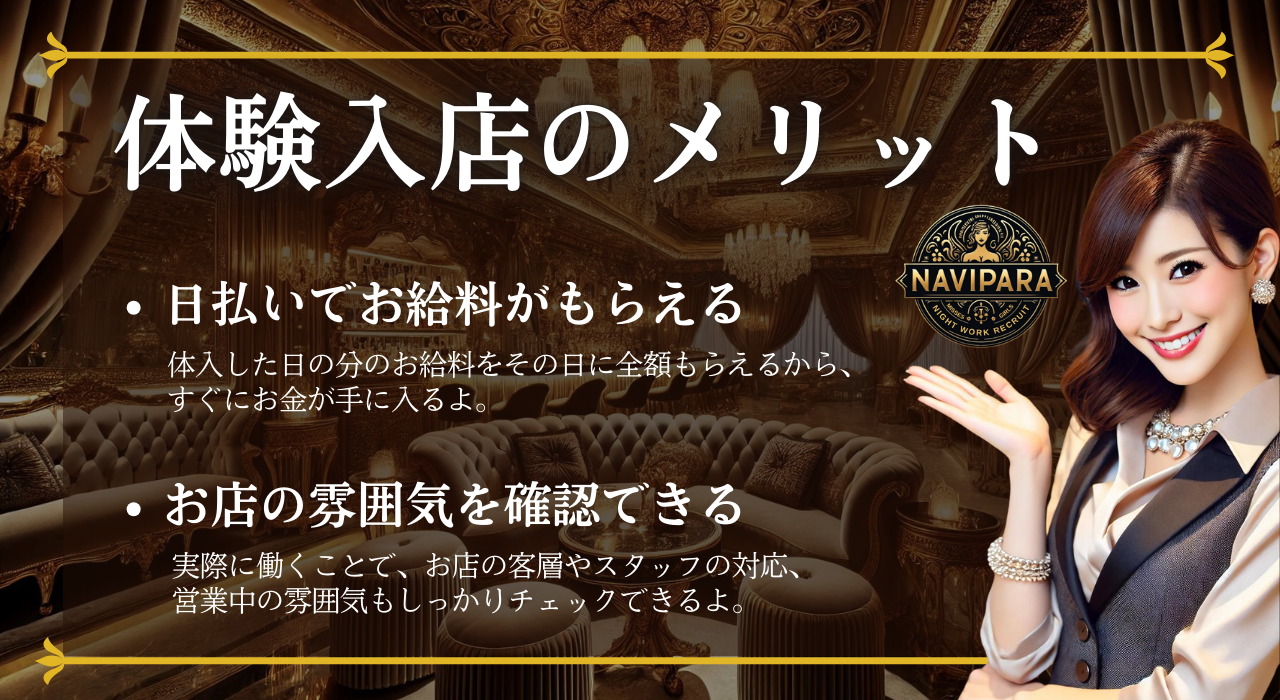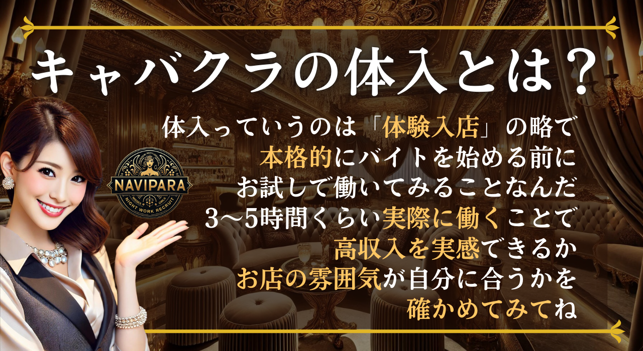 体入っていうのは「体験入店」の略で、本格的にバイトを始める前にお試しで働いてみることなんだ。3~5時間くらい実際に働くことで、高収入を実感できるか、お店の雰囲気が自分に合うかを確かめてみてね。