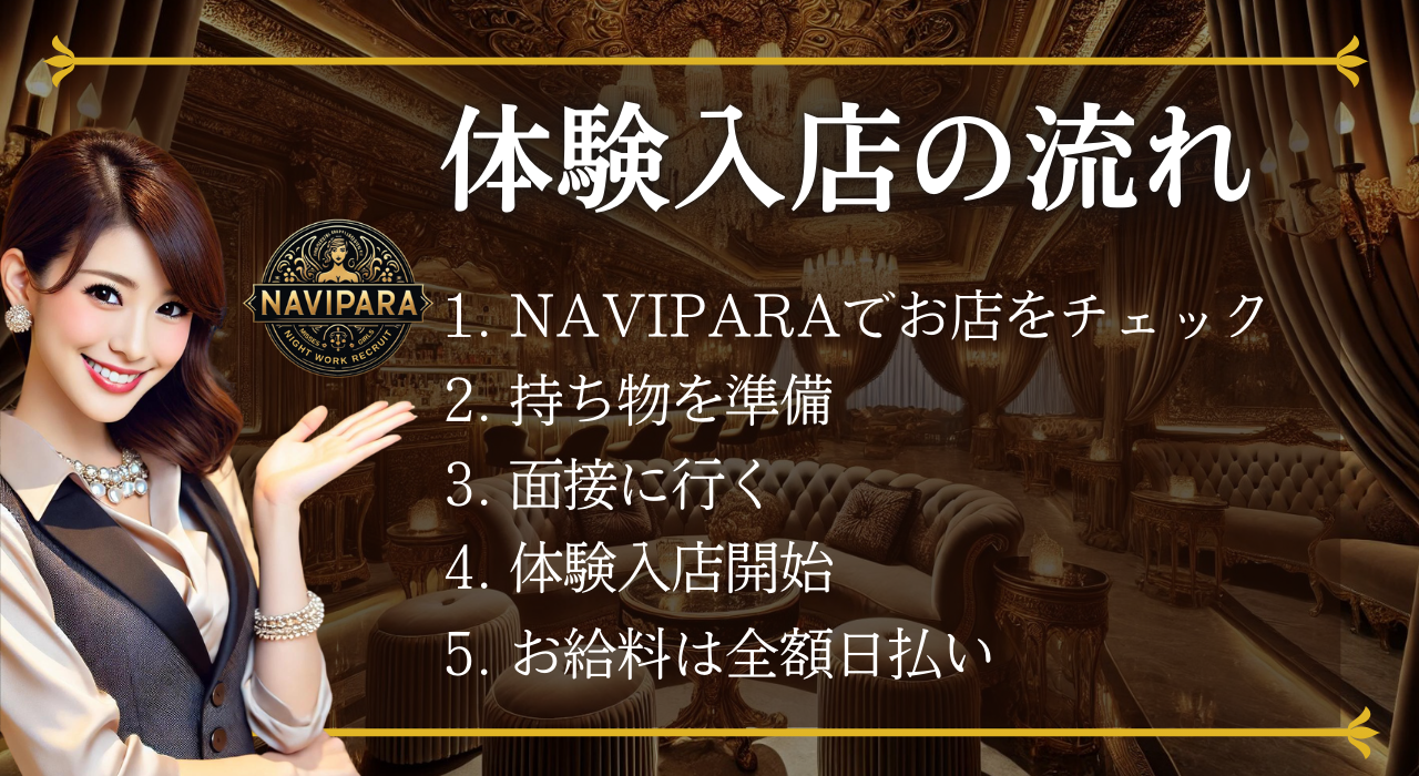 まずはNAVIPARAで興味のあるお店を探してみて。気になるお店が見つかったら、LINEや応募フォームから「体入希望」を伝えてみよう。