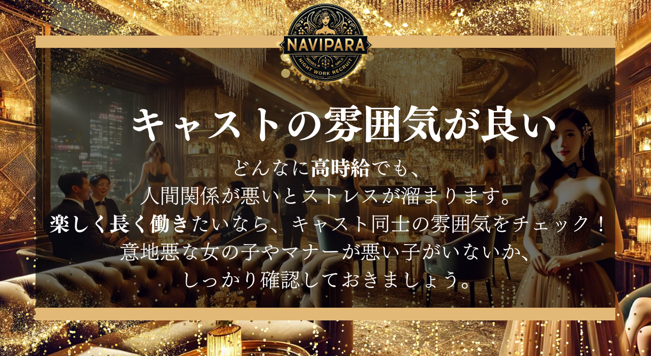 どんなに高時給でも、人間関係が悪いとストレスが溜まります。楽しく長く働きたいなら、キャスト同士の雰囲気をチェック!意地悪な女の子やマナーが悪い子がいないか、しっかり確認しておきましょう。